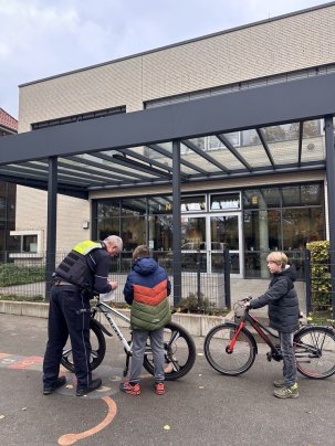 Αμέσως κατά την έναρξη της σχολικής ημέρας, ο κ. Meyer και ο κ. Knief από την αστυνομία ήρθαν στην αυλή του σχολείου. Ήταν πολύ συναρπαστικό για τους μαθητές να δουν από κοντά ένα πραγματικό περιπολικό της αστυνομίας. Στη συνέχεια ακολούθησε ο έλεγχος των ποδηλάτων. Τα ποδήλατα που ήταν εντάξει στο δρόμο έλαβαν αμέσως το αντίστοιχο αυτοκόλλητο. Τα κορίτσια και τα αγόρια ήταν στη συνέχεια εμφανώς περήφανα που επιδείκνυαν τα ποδήλατά τους που ήταν κατάλληλα για κυκλοφορία.