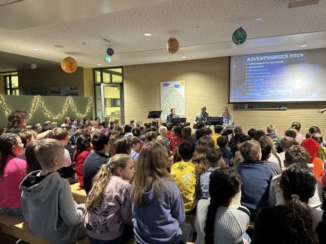 The children were amazed and applauded when they saw their teachers at the instruments. Many thanks to Ms. Immink (euphonium), Ms. Guth-Albermann (flute), Mr. Koch (piano) and Mr. Knoche (tenor saxophone), who spent many extra hours rehearsing in the days before to prepare for this school event.