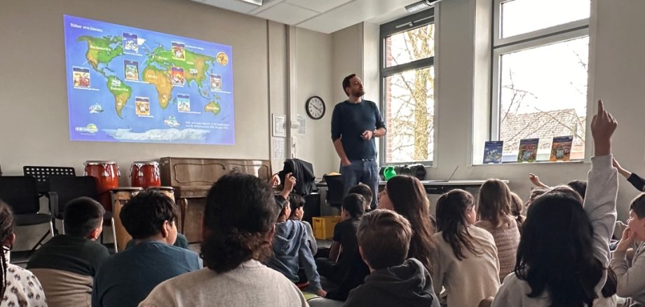 Ben Wallenborn, mieux connu des élèves sous le nom de "Ben von den Weltenbummler-Kids", a répondu avec gentillesse et patience aux nombreuses questions des enfants intéressés. Il a décrit comment les histoires vivantes de ses livres ont été et continuent d'être écrites. Avec sa femme et ses trois enfants, il a voyagé dans de nombreux pays du monde. C'est de cette expérience personnelle de voyage qu'est née l'idée de la série de livres pour enfants : "B-OB Coddiwomple et les enfants globe-trotters". Chaque livre se déroule dans un pays différent et combine une histoire d'aventure divertissante avec des aperçus adaptés aux enfants sur la culture, les gens et les particularités de chaque région.