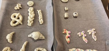 その後、食堂の厨房は大いに盛り上がりました:各グループは自分たちでクワルクとオイルの生地を作りました。秤量、計量、こね、かき混ぜ、切り出し、編み込みまで。その結果、独創的で個性的なお菓子がたくさんできあがり、子どもたちはとても誇らしげでした。