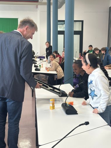 市長になって何年ですか?なぜ市長になろうと思ったのですか?どこで生まれましたか?好きな色は?ドエトコット氏は、2019年から市長に就任したことを子どもたちに辛抱強く説明し、好奇心旺盛な子どもたちからの質問にすべて答えました。市長はまた、子どもたちにもっと優しいグローナウにするために、子どもたちのアイデアや希望に耳を傾ける時間も取りました。サッカークラブや遊び場の増設から、学校の提案や変更まで、子どもたちからはよく考えられた提案がたくさん出され、ドートコッテ市長も興味深く受け止めていました。