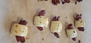 Mēs gatavojām "krabjus" no kārtainās mīklas un vistas desiņām. Dažreiz tie tā neizskatījās, bet garšoja lieliski. Viens bērns, kamēr mēs gaidījām, ieskatījās cepeškrāsnī un ar jautrību teica: "Es esmu pagatavojis kaķi!". Visi iesaistītie no sirds izsmējās.